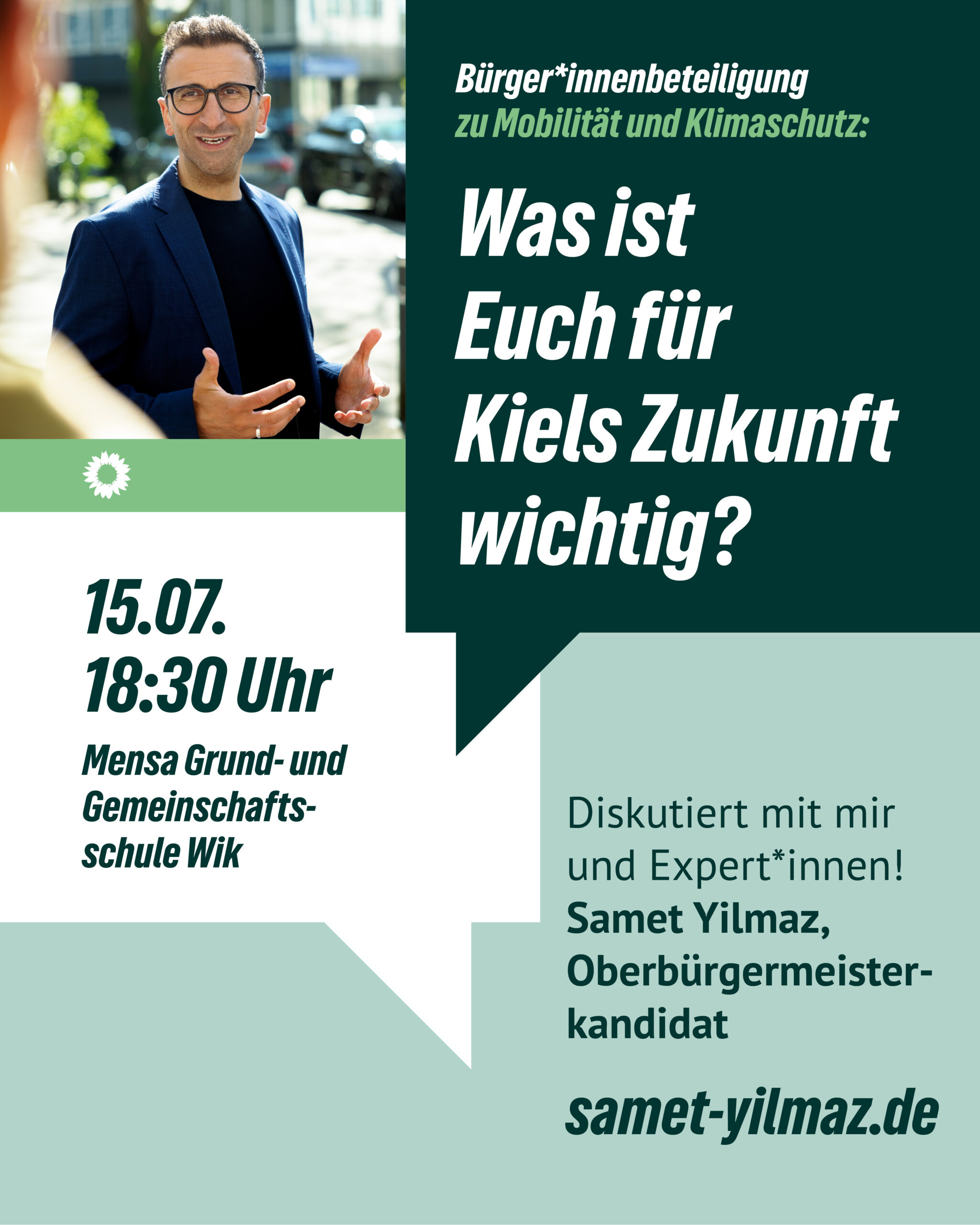 Dieses Mal: Mobilität und Klimaschutz: am Dienstag, den 15. Juli um 18 Uhr in der Mensa der Grund- und Gemeinschaftsschule Wik (Elendsredder 26, 24106).